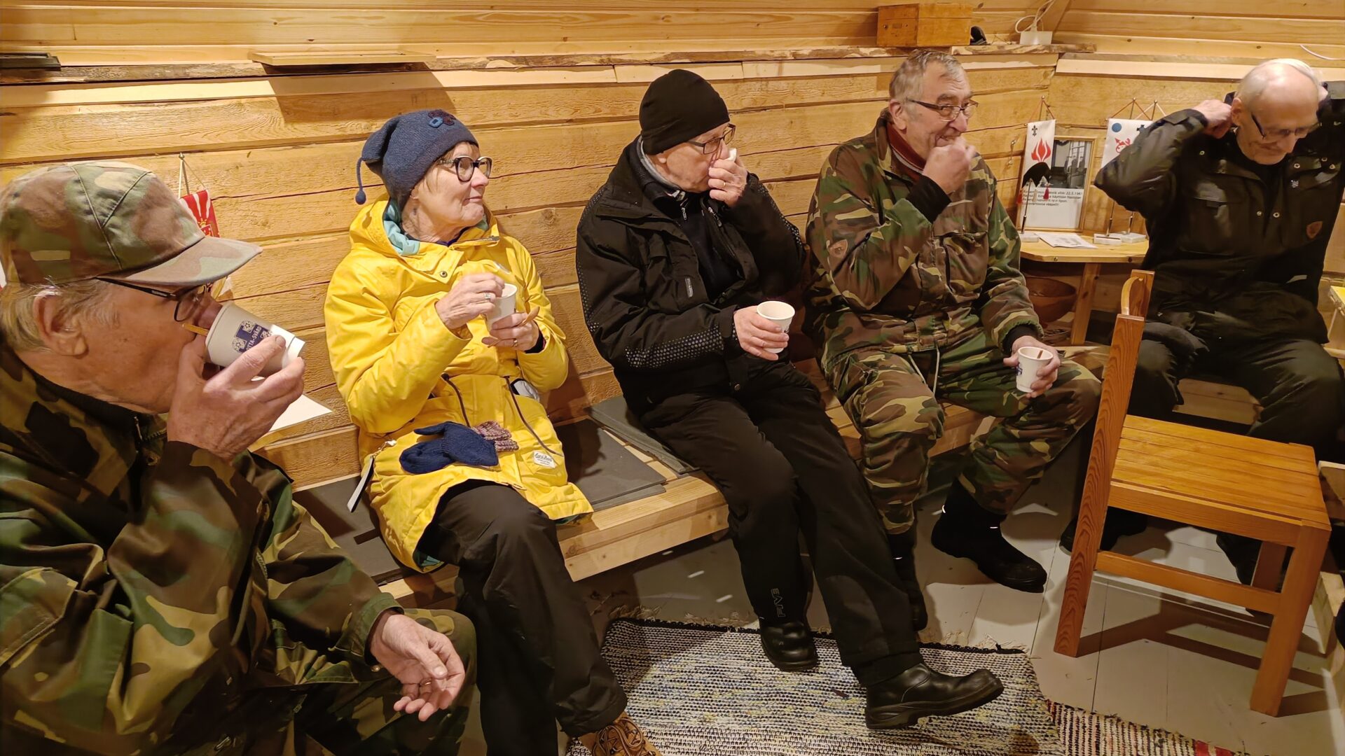Kodan lämmössä nautittiin Maanpuolustusnaisten tarjoamasta glögistä ja pikkupurtavasta.