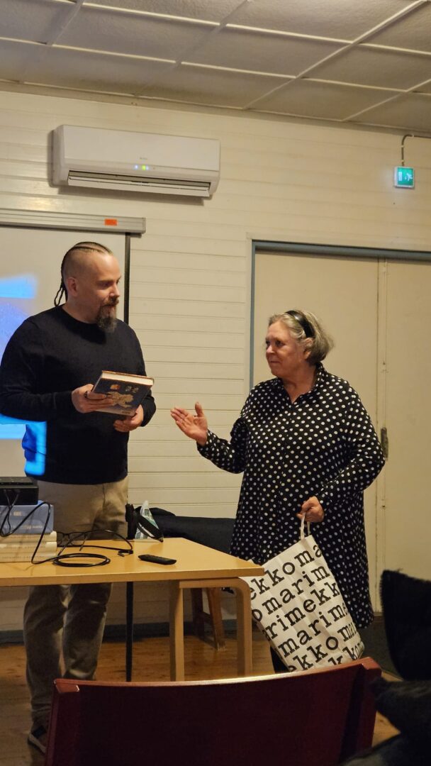 Esitelmöitsijälle luovutettiin kirja : Marja Huovilan koostama ”Kaikki isänmaan puolesta Nastolassa – suojeluskunta, lotat ja vankileirit 1917-1944”